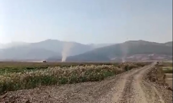 Kahramanmaraş’ın Türkoğlu ilçesinde bulunan Sağlık ovasında (Gavur Gölü) çıkan hortum hasat yapan çiftçileri korkuttu.