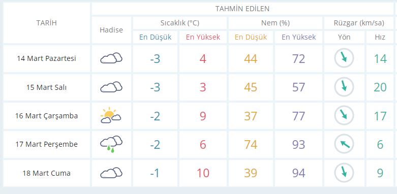 14 Mart Pazartesi günü en düşük sıcaklık -3 derece, en yüksek sıcaklık ise 4 derece yağışlı olacak.