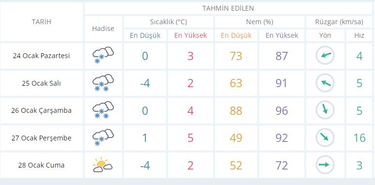 27 Ocak Perşembe günü en düşük sıcaklık 1 derece, en yüksek sıcaklık ise 5 derece kar yağışlı olacak.