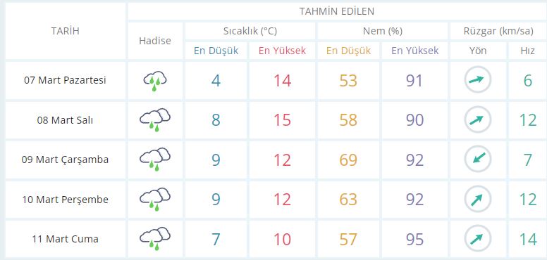 7 Mart Pazartesi günü en düşük sıcaklık 4 derece, en yüksek sıcaklık ise 14 derece yağışlı olacak.