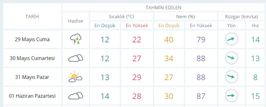 31 Mayıs Pazar günü en düşük sıcaklık 13 derece, en yüksek sıcaklık ise 29 derece açık az bulutlu olacak.