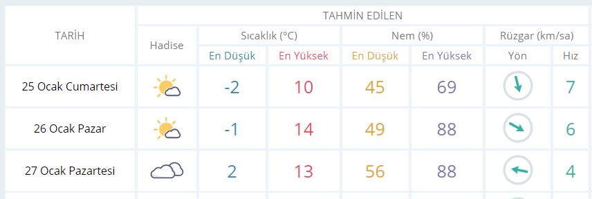 11 Ocak Cumartesi günü en düşük sıcaklık -2 derece, en yüksek sıcaklık ise 10 derece güneşli parçalı bulutlu olacak.