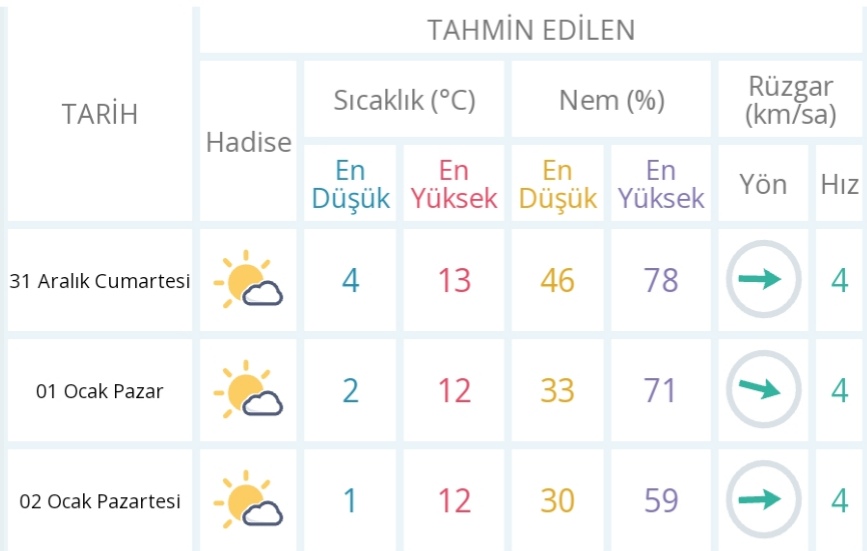 31 Aralık Cumartesi günü en düşük sıcaklık 4 derece, en yüksek sıcaklık ise 13 derece açık az bulutlu olacak.