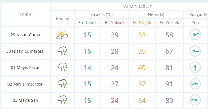30 Nisan Cumartesi günü en düşük sıcaklık 16 derece, en yüksek sıcaklık ise 29 derece yağışlı olacak.