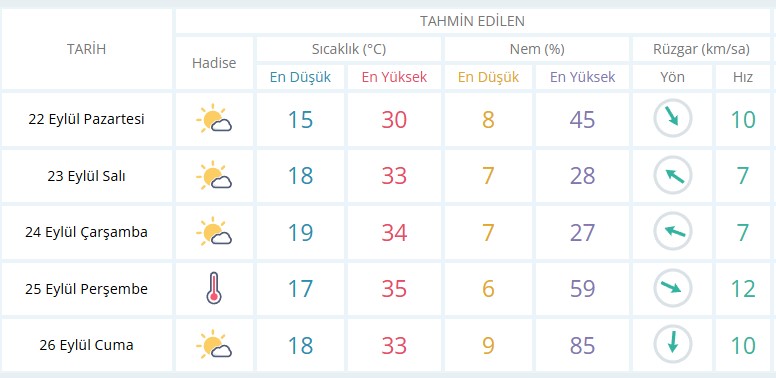 22 Eylül Pazartesi günü en düşük sıcaklık 15 derece, en yüksek sıcaklık ise 30 derece az bulutlu olacak.