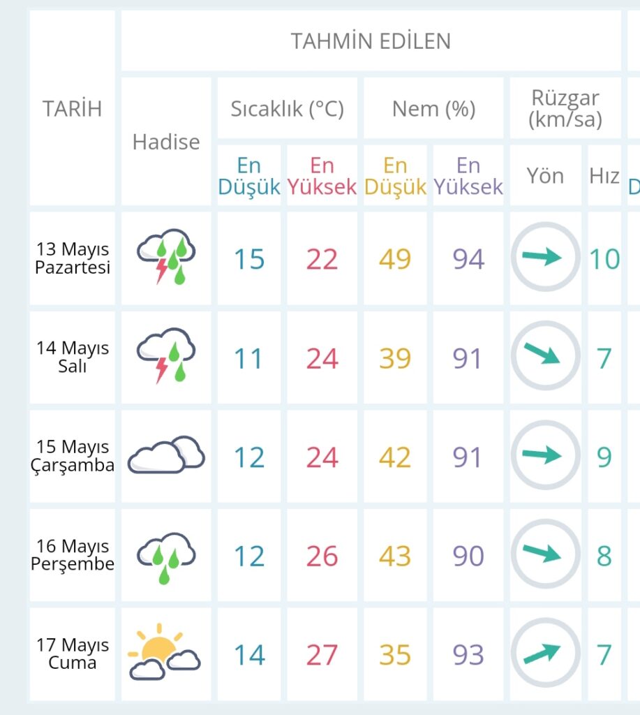 13 Mayıs Pazartesi günü en düşük sıcaklık 15 derece, en yüksek sıcaklık ise 22 derece yağmurlu olacak.