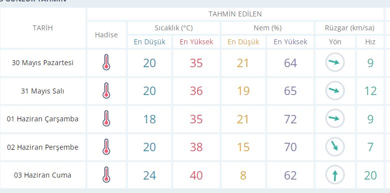 30 Mayıs Pazartesi günü en düşük sıcaklık 20 derece, en yüksek sıcaklık ise 35 derece sıcak olacak.