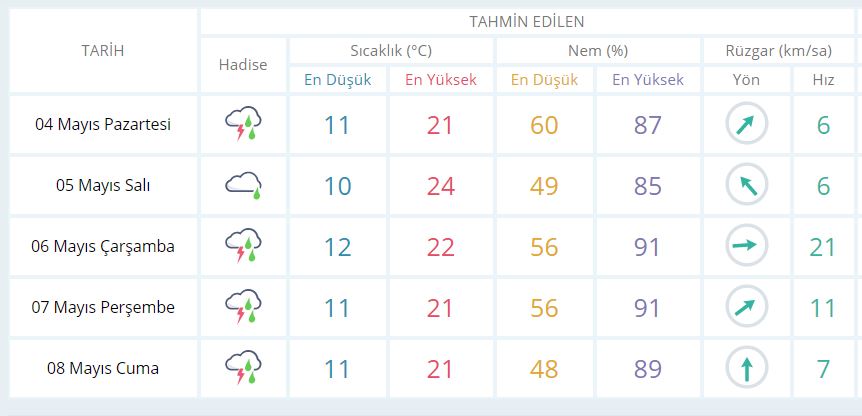 4 Mayıs Pazartesi günü en düşük sıcaklık 11 derece, en yüksek sıcaklık ise 21 derece yağışlı olacak.