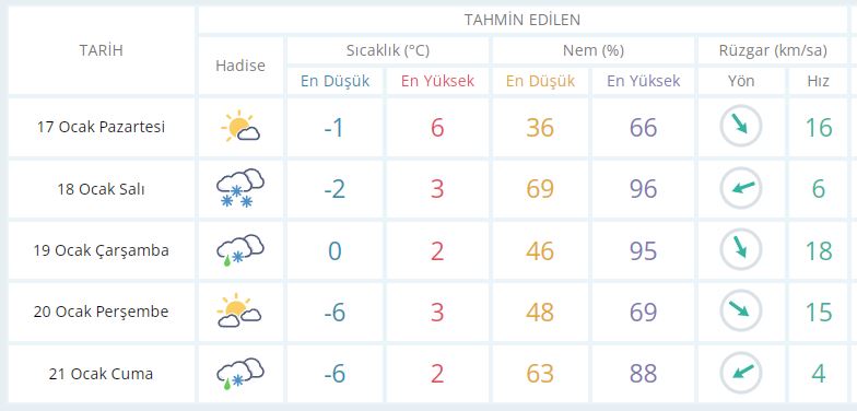17 Ocak Pazartesi günü en düşük sıcaklık – 1 derece, en yüksek sıcaklık ise 6 derece açık az bulutlu olacak.