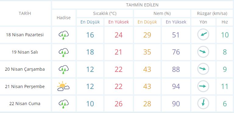 18 Nisan Pazartesi günü en düşük sıcaklık 16 derece, en yüksek sıcaklık ise 24 derece yağışlı olacak.