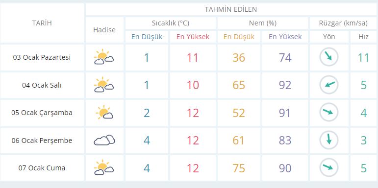 3 Ocak Pazartesi günü en düşük sıcaklık 1 derece, en yüksek sıcaklık ise 11 derece parçalı bulutlu olacak.
