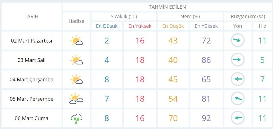 5 Mart Perşembe günü en düşük sıcaklık 7 derece, en yüksek sıcaklık ise 18 derece bulutlu olacak.