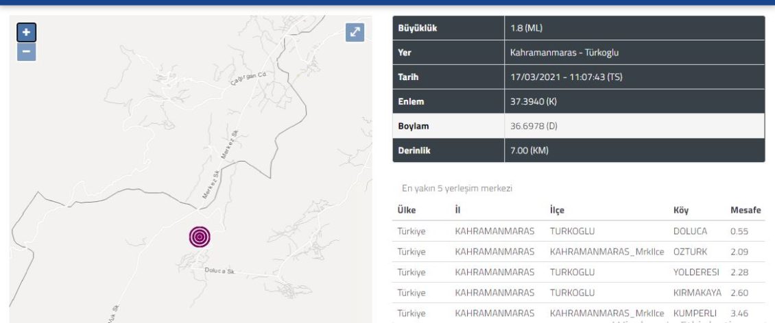 Ancak Afet ve Acil Durum Yönetimi Başkanlığı, Deprem Dairesi Başkanlığı ise aynı saatte merkez üssü yine Türkoğlu ilçesine bağlı Doluca Mahallesi olan 1,8 şiddetinde yerin 7 kilometre derinliğinde bir deprem olduğunu açıkladı.