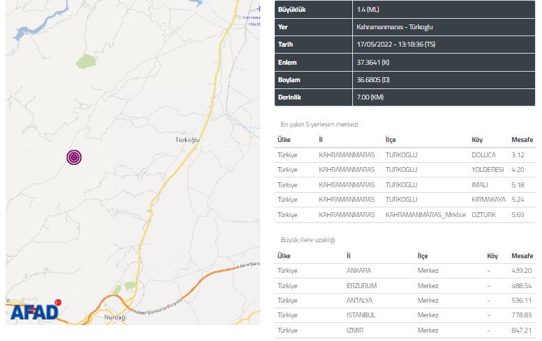 AFAD, Deprem Dairesi Başkanlığı’ndan alınan bilgiye göre Türkoğlu ilçesine bağlı Doluca Mahallesi yakınlarında bulunan Hoğdu yaylası ile Çataloluk mesire alanı arasında hafif şiddetli bir deprem meydana geldi. Dün öğle saat 13:18’de yerin 7 kilometre derinliğinde 1,4 büyüklüğünde meydana gelen deprem hafif şiddetli olması nedeniyle hissedilmedi.