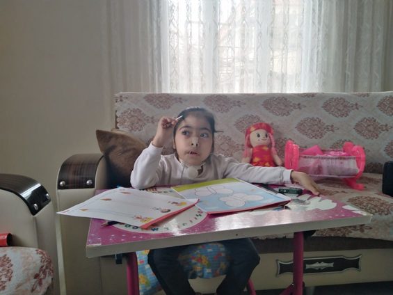 Kahramanmaraş’ın Türkoğlu ilçesinde rahatsızlığı nedeniyle okula gidemeyen spina bifida hastası Melek Rana Hasırcı evde eğitim hizmeti almanın mutluluğunu yaşıyor.