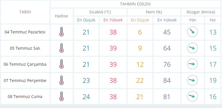 5 Temmuz Salı günü en düşük sıcaklık 21 derece, en yüksek sıcaklık ise 39 derece açık ve sıcak olacak.