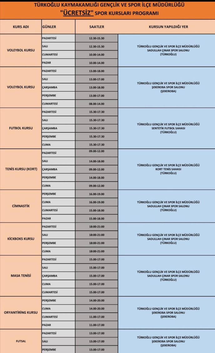 Türkoğlu ilçesinde futbol, voleybol, cimnastik, kick boks, tenis, masa tenisi, oryantiring ve futsal branşlarında ücretsiz spor kursları verilecek.