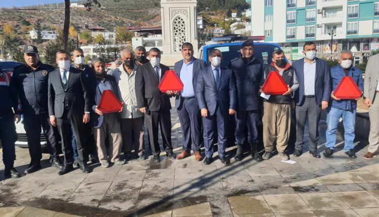 Kahramanmaraş‘ın Türkoğlu ilçesinde çiftçilerin trakötrlerini daha güvenli kullanabilmeleri için rops demiri ile birlikte reflektör dağıtıldı.