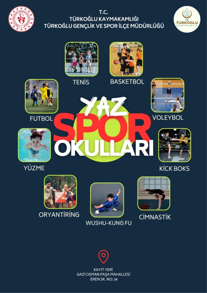 Türkoğlu ilçe merkezinde düzenlenen Spor okullarına katılmak isteyenler Gaziosmanpaşa mahallesi, Eren sokak no:24 adresindeki Türkoğlu Gençlik ve Spor İlçe Müdürlüğüne mesai saatleri içerisinde başvurarak kayıt olabilirler.