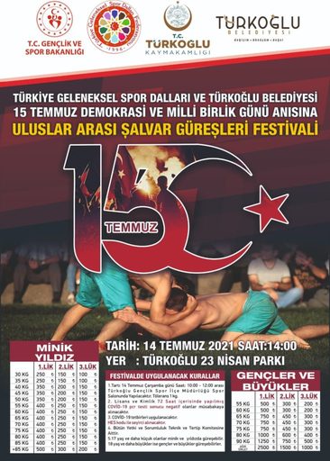 Türkiye Geleneksel Spor Dalları Federasyonu ve Türkoğlu Belediyesi ortaklığında Türkoğlu ilçesinde 14 Temmuz 2021 saat 14.00’te Uluslararası Şalvar Güreşleri Festivali Düzenlenecek.