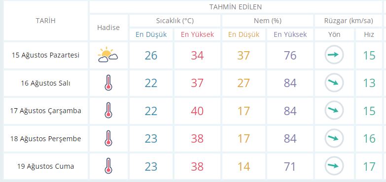 17 Ağustos Çarşamba günü en düşük sıcaklık 22 derece, en yüksek sıcaklık ise 40 derece açık ve sıcak olacak.