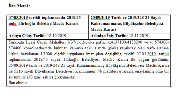 Türkoğlu İlçesi Ceceli Mahallesi N37-b-12-c-2-a pafta, x:4137100-4138200 ve y:574300-574400 koordnatlarında bulunan kamuya tekli alanda yapılacak olan trafo alanına ilişkin hazırlanan 1/1000 ölçekli uygulama imar plan değişikliği ilanı;