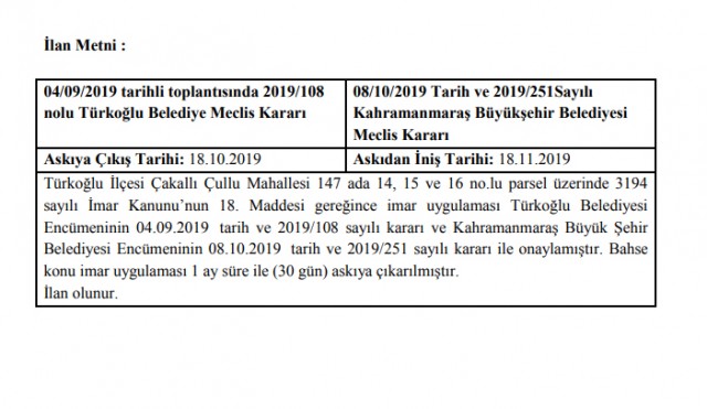 Türkoğlu İlçesi Çakallı Çullu Mahallesi 147 ada 14,15 ve 16 no.lu parsel üzerinden 3194 sayılı İmar Kanunu’nun 18. Maddesi gereğince imar uygulaması ilanı;