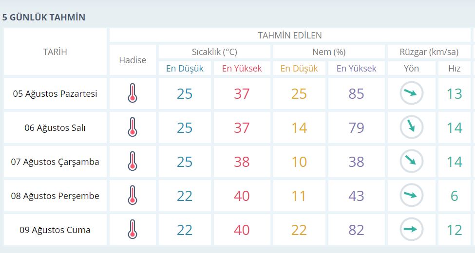 5 Ağustos Pazartesi günü en düşük sıcaklık 25 derece, en yüksek sıcaklık ise 37 derece olacak.