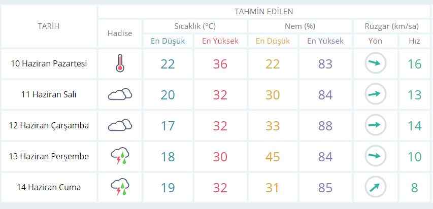 10 Haziran pazartesi günü en düşük sıcaklık 22 derce, en yüksek sıcaklık ise 36 derece olacak.