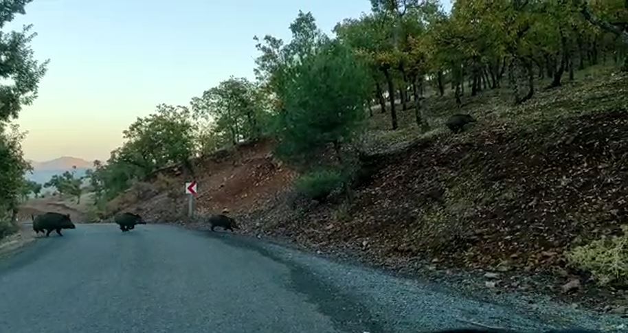 Yiyecek arayan yaban domuzu sürüsü yoldan geçtiği sırada aracını durdurarak kameraya alan vatandaşlar bu kadar kalabalık bir yaban domuzu sürüsünü ilk defa gördüklerini ifade ettiler.