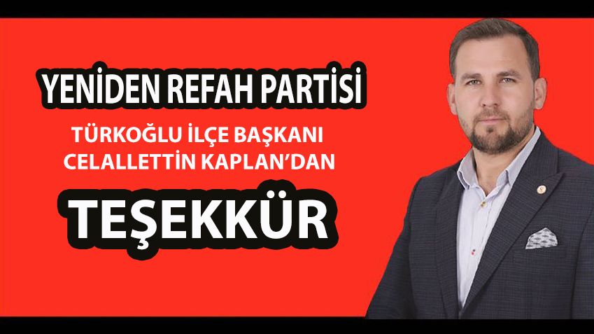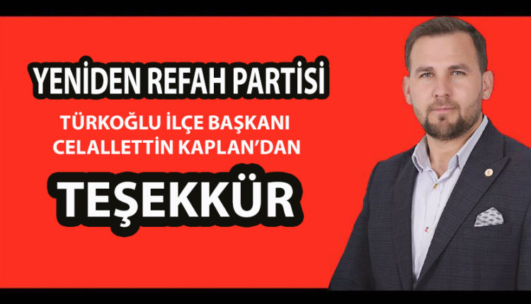 Yeniden Refah Partisi Türkoğlu İlçe Başkanı Celalettin Kaplan, Kongre süreci ve teşkilatlanmadan dolayı Türkoğlu halkına teşekkür etti.